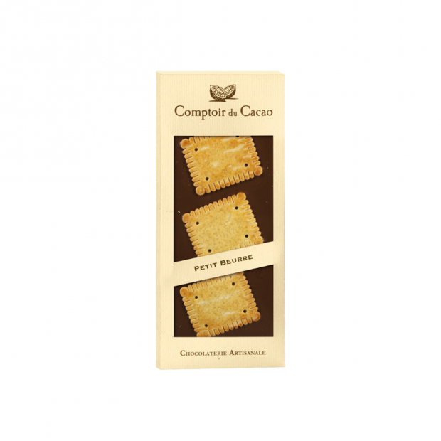 | Ingrédients | Chocolat lait (pâte de cacao 36%, sucre, lait entier en poudre, pur beurre de cacao, lécithine de soja, arôme naturel de vanille, sel). Petit beurre (farine de blé (gluten), sucre, beurre frais de baratte (lait) 20%, oeufs frais entiers, jaunes d'oeufs, poudre de lait écrémé, sel de guérande, poudre à lever (diphosphate disodique, carbonate acide de sodium), arôme naturel. Traces éventuelles d'arachides, fruits à coques. |